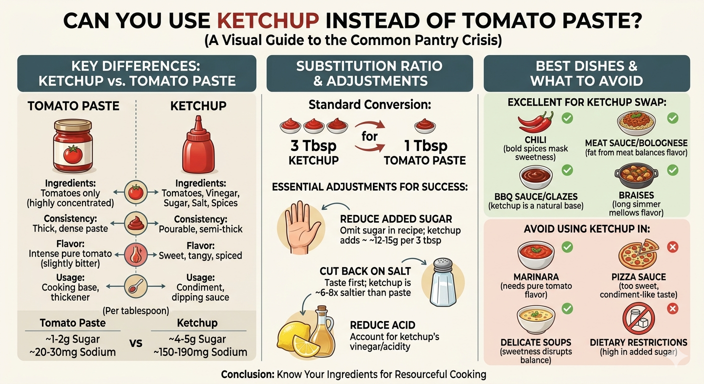 Rimanere senza concentrato di pomodoro a metà ricetta è una crisi comune in cucina. Scruti la tua dispensa e individui una bottiglia di ketchup - la domanda diventa immediatamente: può fare il lavoro? La risposta breve è sì, con alcune avvertenze. Ketchup come sostituto del concentrato di pomodoro è utilizzabile in molti piatti salati, ma non è un sostituto immediato. I due condimenti sono a base di pomodori, ma sono prodotti fondamentalmente diversi con profili aromatici, contenuto di zucchero e concentrazioni diversi.